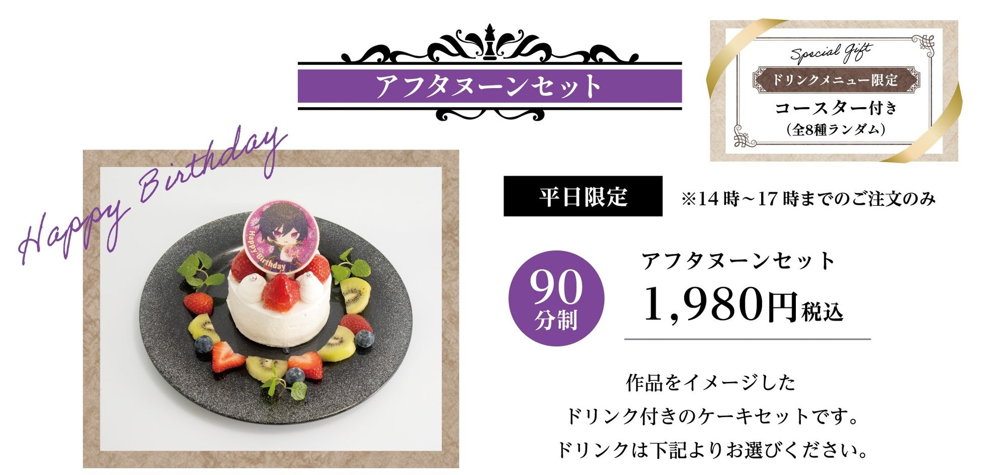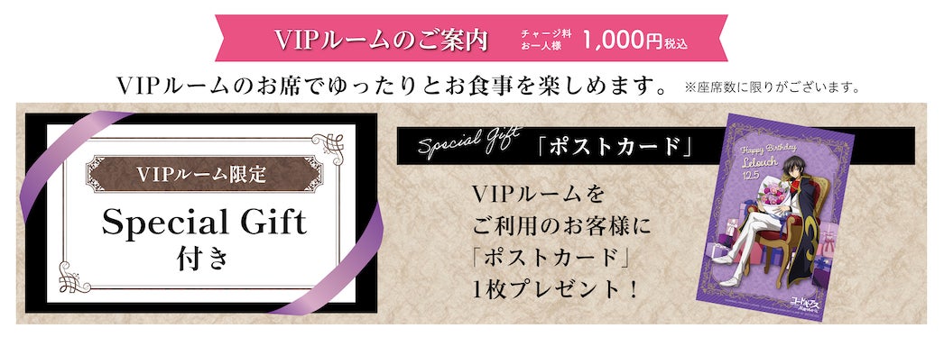 DISHUP限定のグッズや、コースメニュー限定ノベルティ、過去イベントの映像放映(VIPルーム限定)、さらに今回は12月5日のルルーシュの誕生日に合わせて“Birthday Party”と題し、特別な店内装飾など、皆様にお楽しみいただけるコンテンツを多数ご用意してお待ちしております。