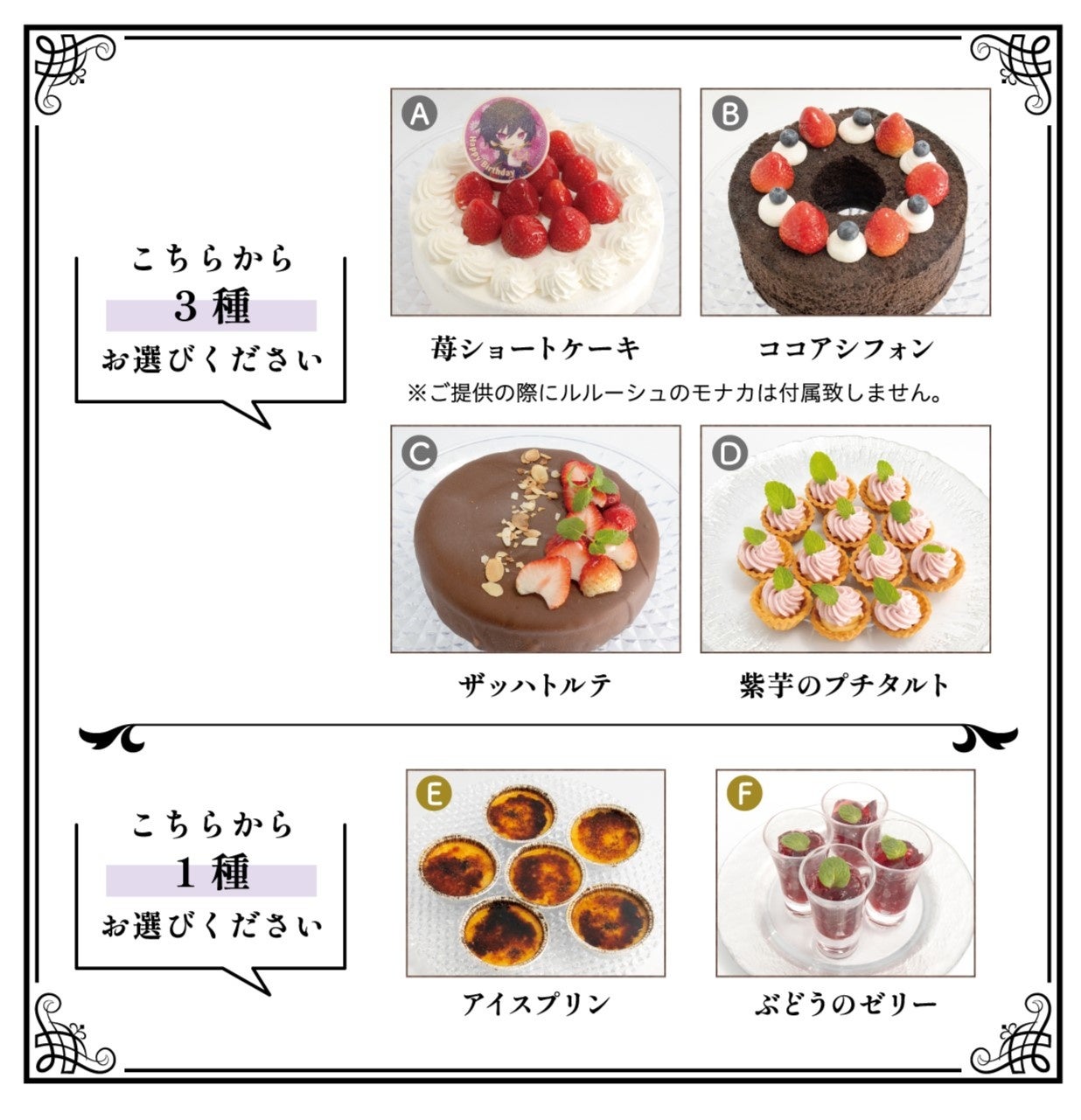 ・デザートプレート(デザートメニューよりお選びいただいたスイーツ【ケーキから3種、ゼリーまたはアイスから1種】でプレートをご用意いたします)