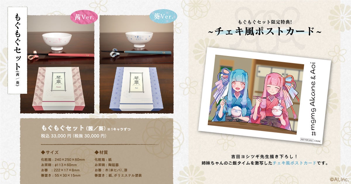 | もぐもぐセット(葵) | お茶碗、お箸、箸置き 各1個ずつ | 13,200円 | チェキ風ポストカード |