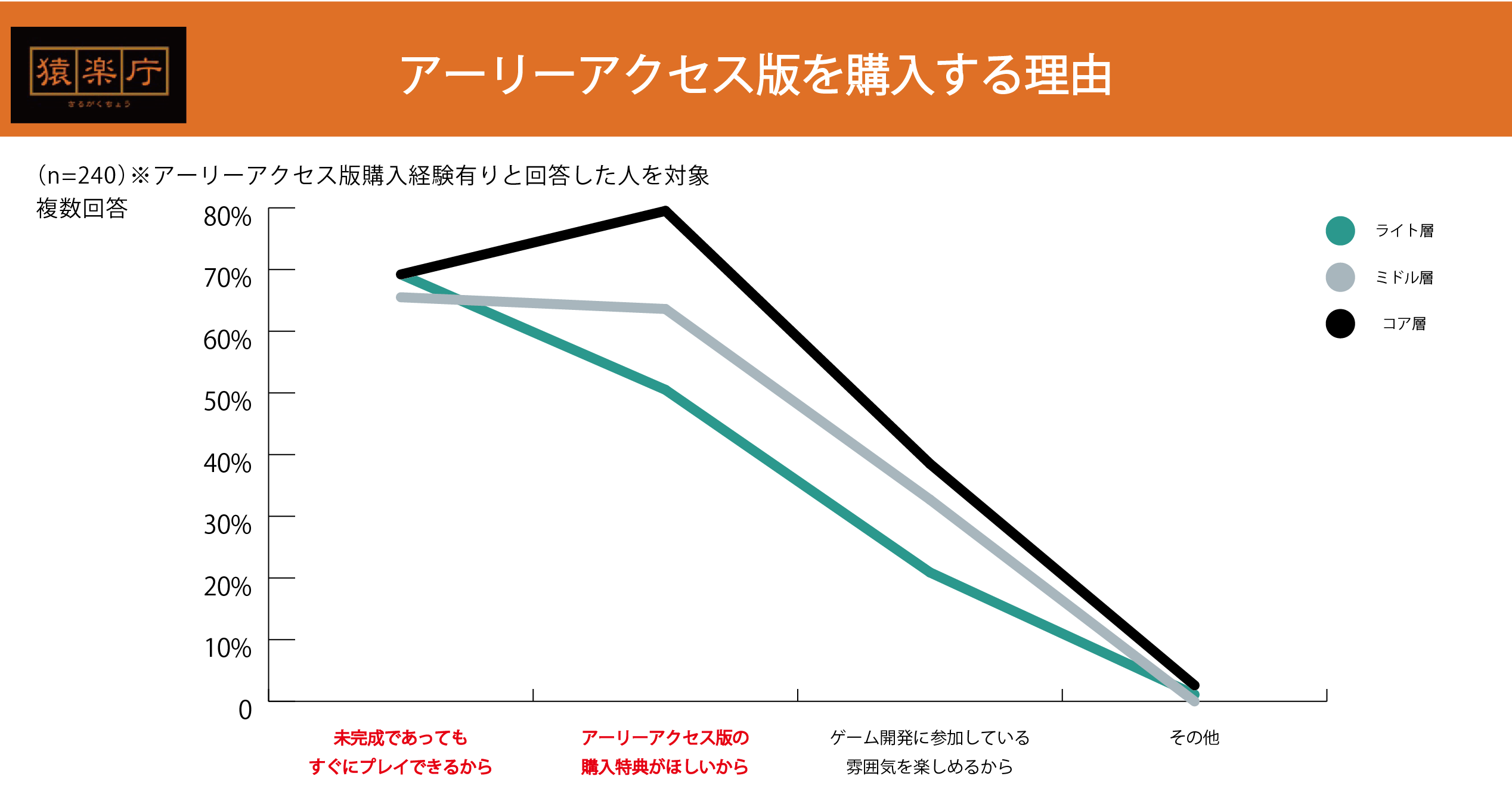 ユーザーがアーリーアクセス版を購入する理由として、全ての層で「すぐにプレイできるから」の回答が60%以上。「購入特典がほしいから」もほぼ同じ割合となっています。その中でコア層は「すぐにプレイできるから」より、「購入特典がほしいから」が上回る結果となりました。