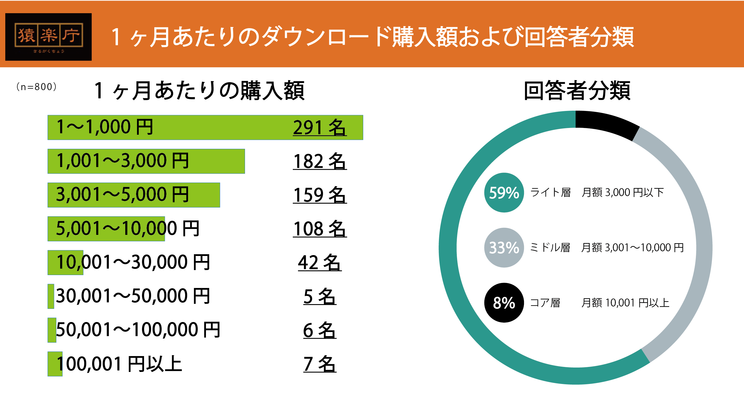 本調査では1ヶ月あたりのダウンロード購入金額において、3,000円以下を「ライト層」、3,001円〜5,000円を「ミドル層」、10,001円以上を「コア層」と3つの層に分類。その結果、最も割合が多い層はライト層で全回答者の59%を占めています。