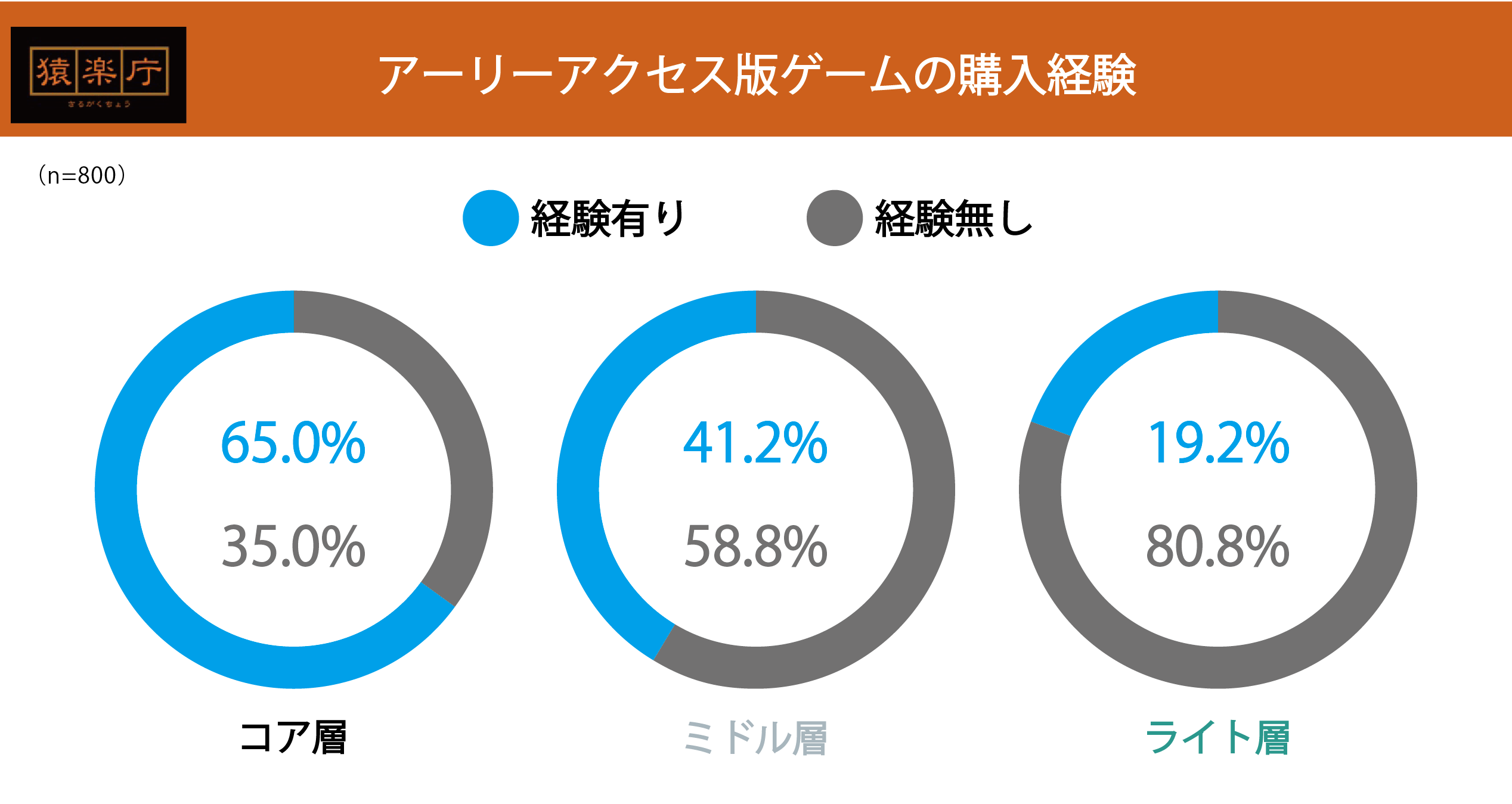 ライト層で「アーリーアクセス版を購入したことがある」回答は約20%、ミドル層とコア層でその割合は増えていき、コア層では約60%が「アーリーアクセス版を購入したことがある」という結果になりました。