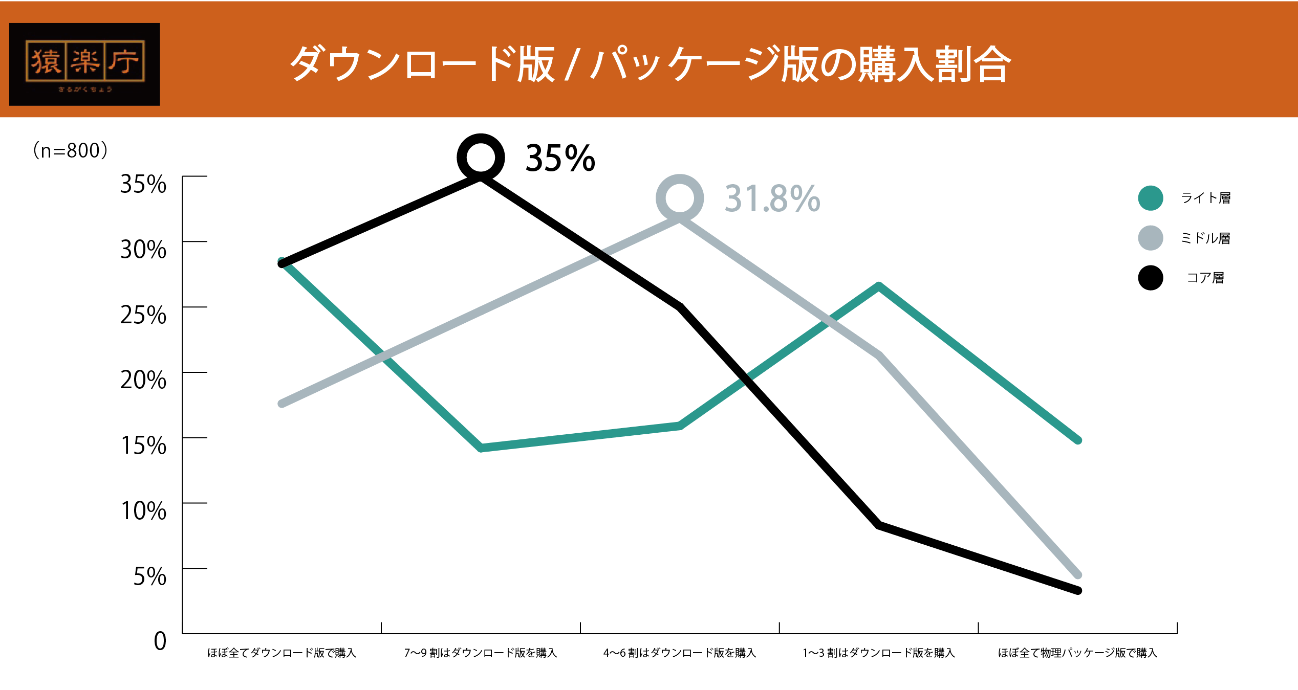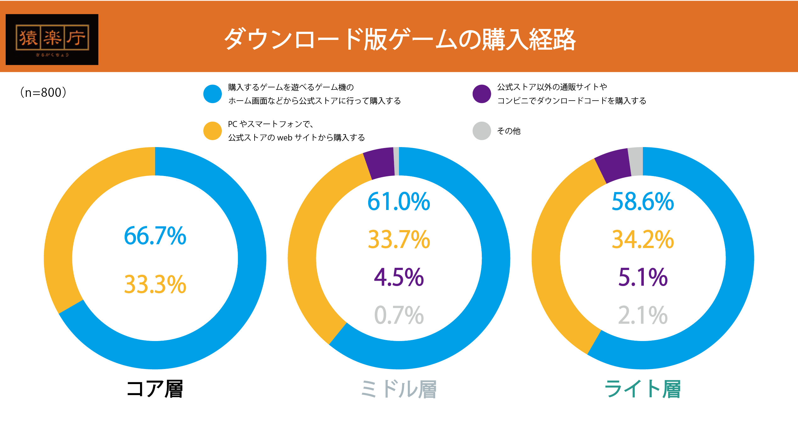 全ての層で「ゲーム機からの購入」が50%以上をマーク。次いで「PCで公式ストアのweb経由」が30%以上を占めています。コア層は「ECサイトやコンビニでの購入」が0%という結果になりました。