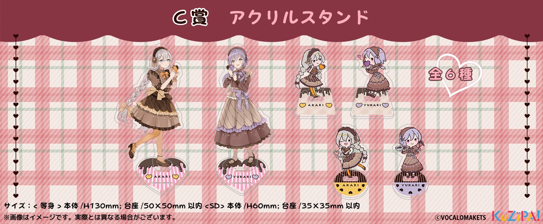 商品は、ファブリックポスター、マウスパッド、アクリルスタンド、クリーナークロス、ハート型缶バッジ、さらにくじを1点購入毎にチャレンジできる「+On Challenge」の景品のマグカップ(melty、chocolate、sweets)もご用意しています。ふりふりメイド服に身を包んだ、結月ゆかり・紲星あかりのクジパ限定描き下ろしグッズを是非ゲットしてください!