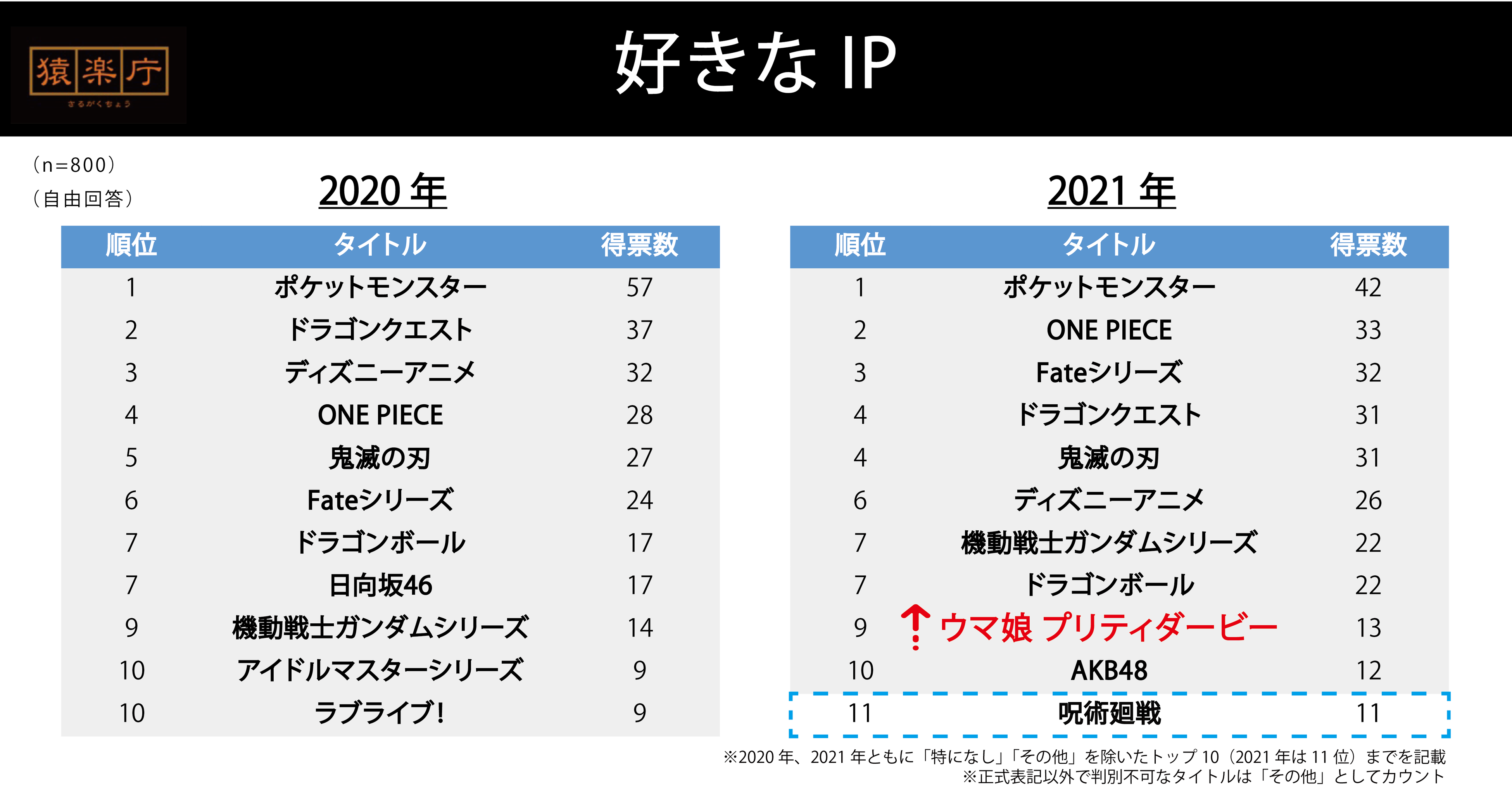 10位以内には入らなかったものの、急激に注目度を高めたIPとして11位に『呪術廻戦』があがっています。『呪術廻戦』は2018年3月に『週刊少年ジャンプ』で連載を開始して以来、着実にファンを集め、2020年10月から2021年3月まで2クールにわたり放送されたアニメは大ヒットを収めました。