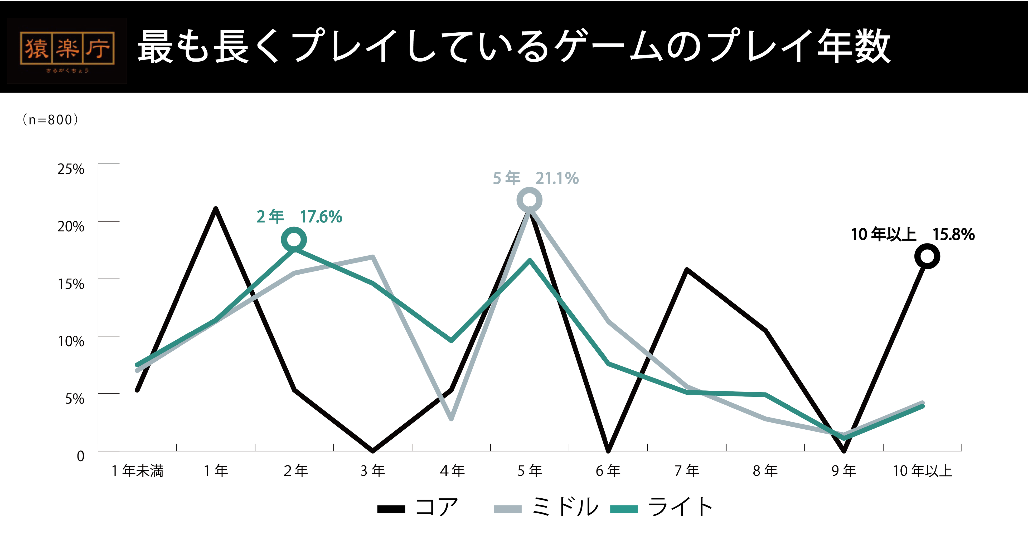 プレイ年数にフォーカスしてみると、ライト層とミドル層は2年〜5年がボリュームゾーンとなっています。コア層は、1年と5年が同スコアで最多の割合を占めているものの、10年以上と答えるユーザーも15%以上にのぼりました。