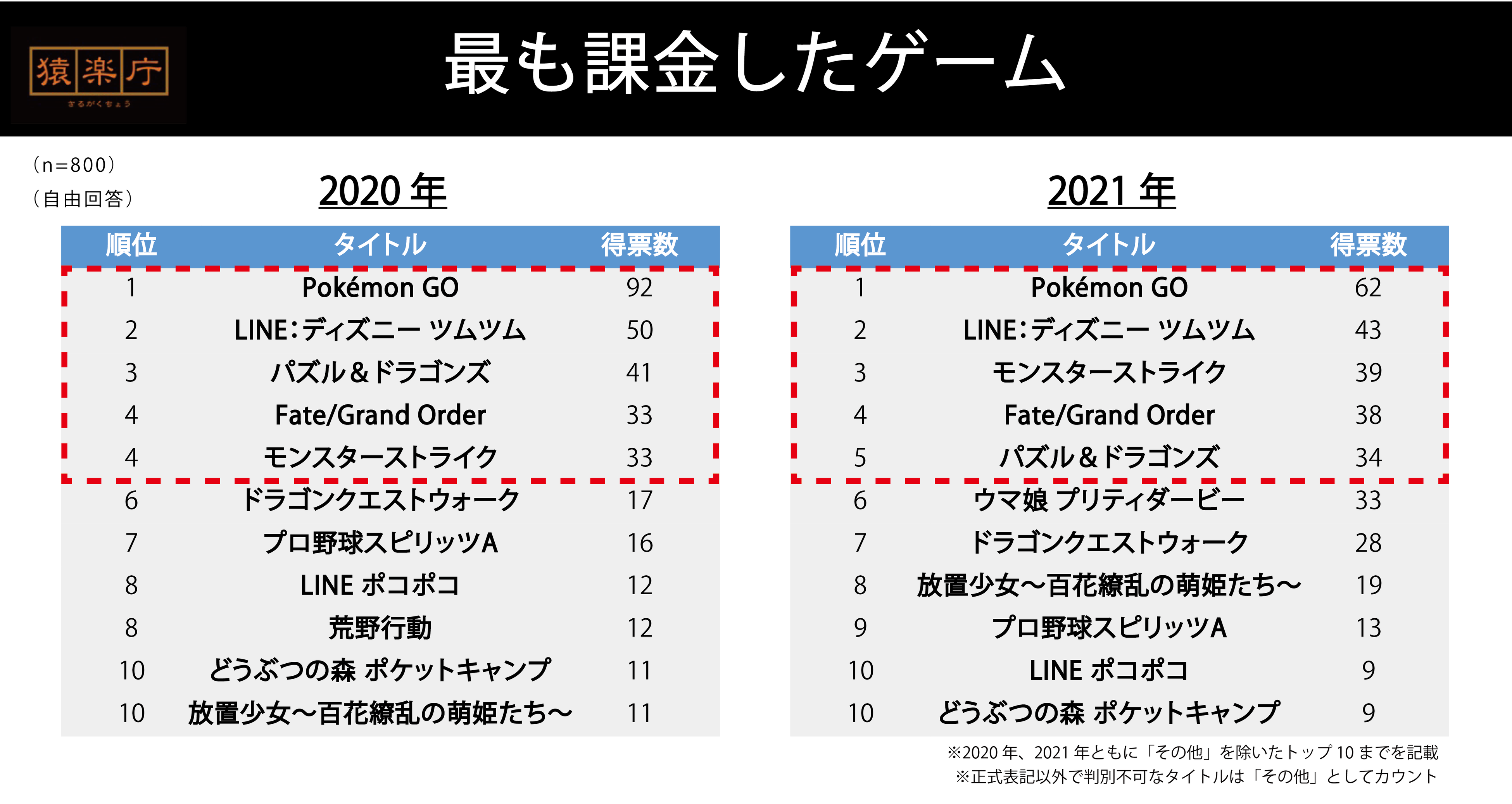 2020年と比較すると大きな違いは無いものの、2021年にリリースされた『ウマ娘 プリティーダービー』が9位にランクインしています。