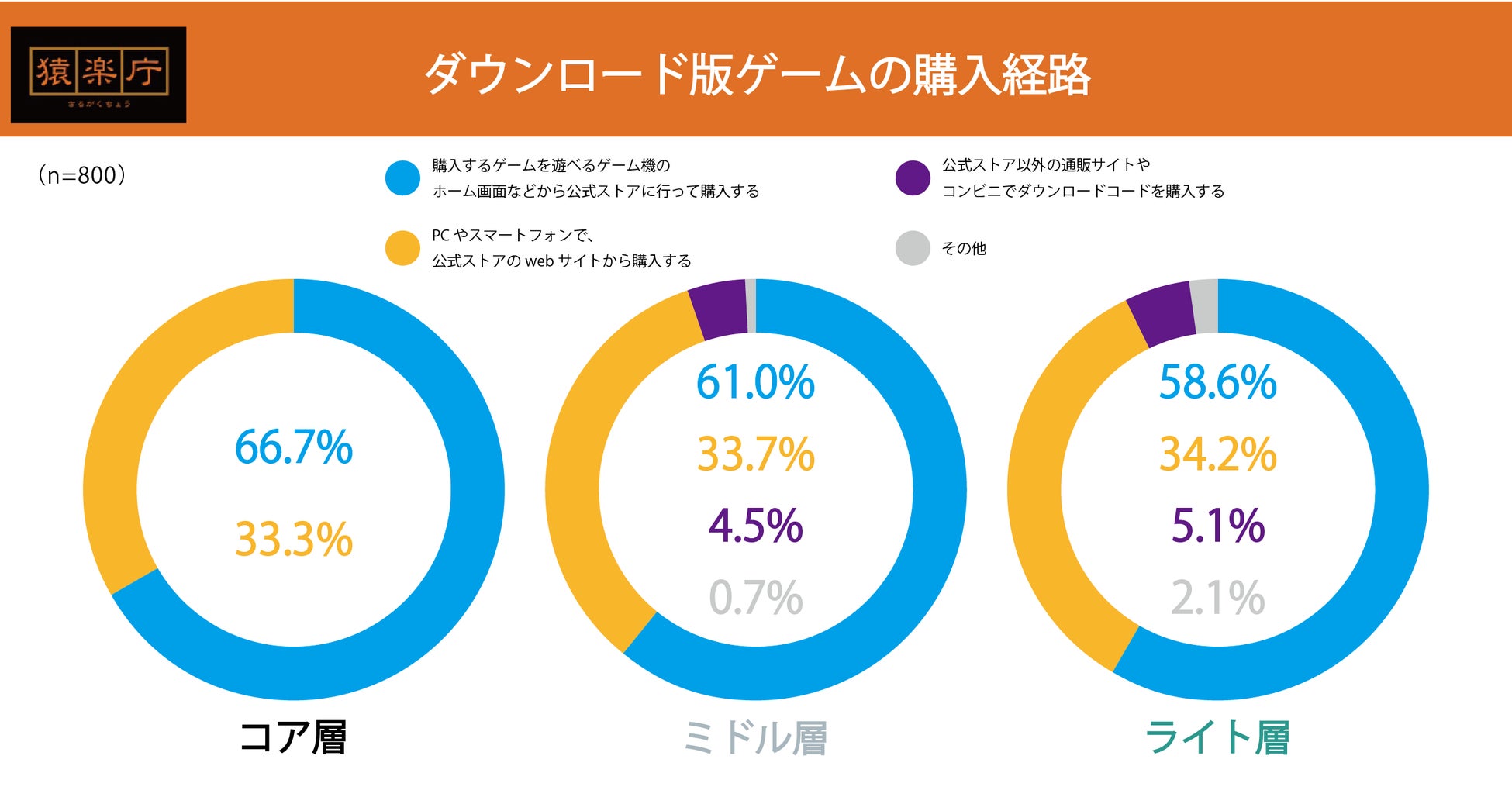 全ての層で「ゲーム機からの購入」が50%以上をマーク。次いで「PCで公式ストアのweb経由」が30%以上を占めています。コア層は「ECサイトやコンビニでの購入」が0%という結果になりました。