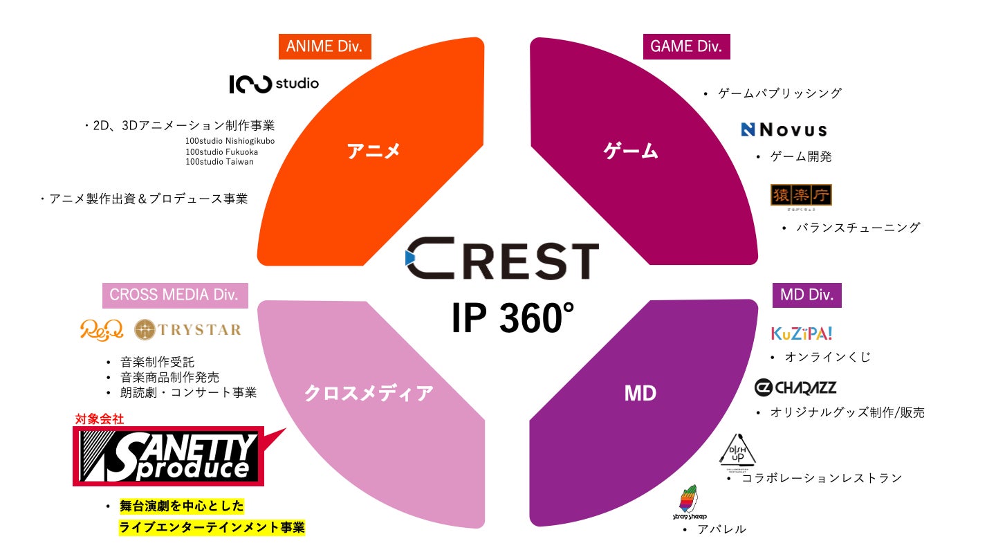 CRESTはIPを主軸としたコンテンツの360°サービスを大幅に強化してまいります。今回、舞台関連サービスに豊富な対応実績を持つSANETTYを加えることで、スピード感をもって、有力IPを原作とした舞台事業のさらなる拡大と舞台発コンテンツの創出やIPの360°展開を加速させていきます。