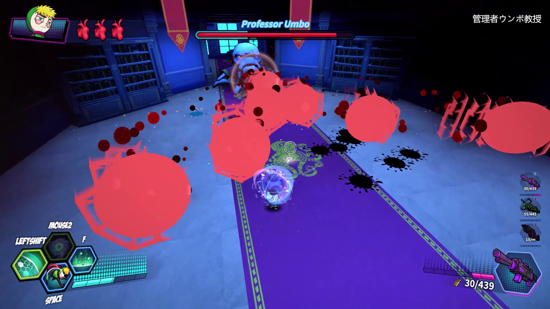 トラップ回避やポジション取りに有効な俯瞰視点と、敵を撃ち抜くリアルな感覚を味わえるTPS視点を使い分ける新感覚アクション。また多種多様な攻撃パターンを持つ強大なボスが多数登場。ゾウ、蜂、タコ、さらには大根やトウモロコシさえガットーに牙を剝く!?