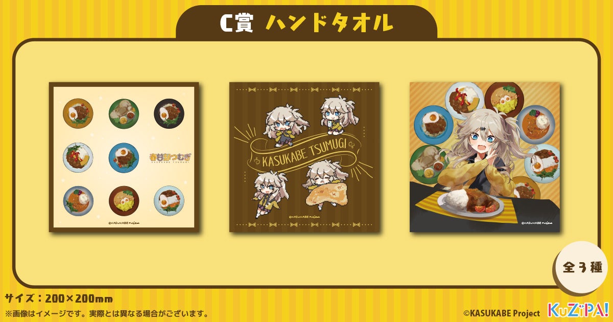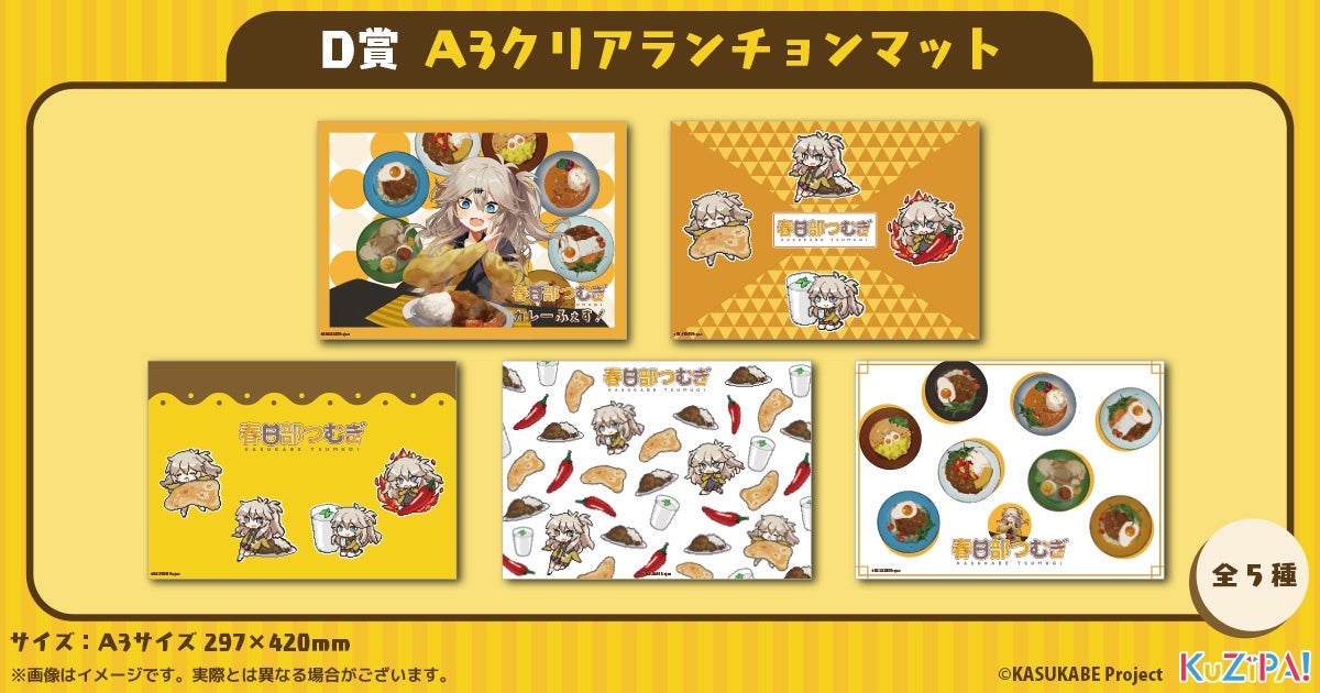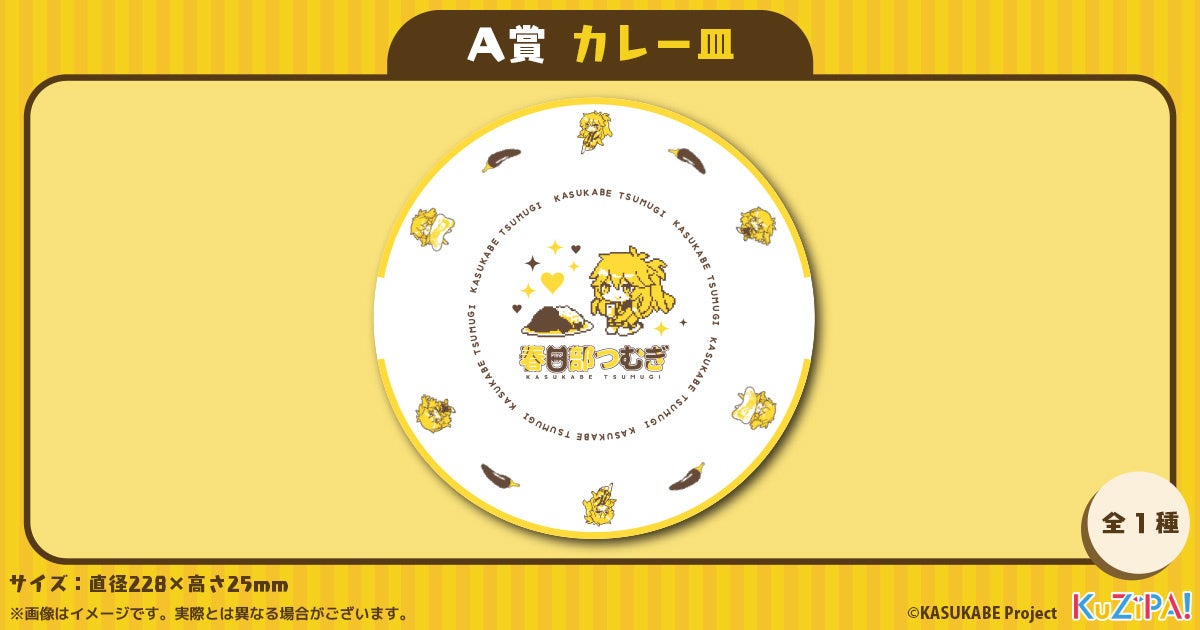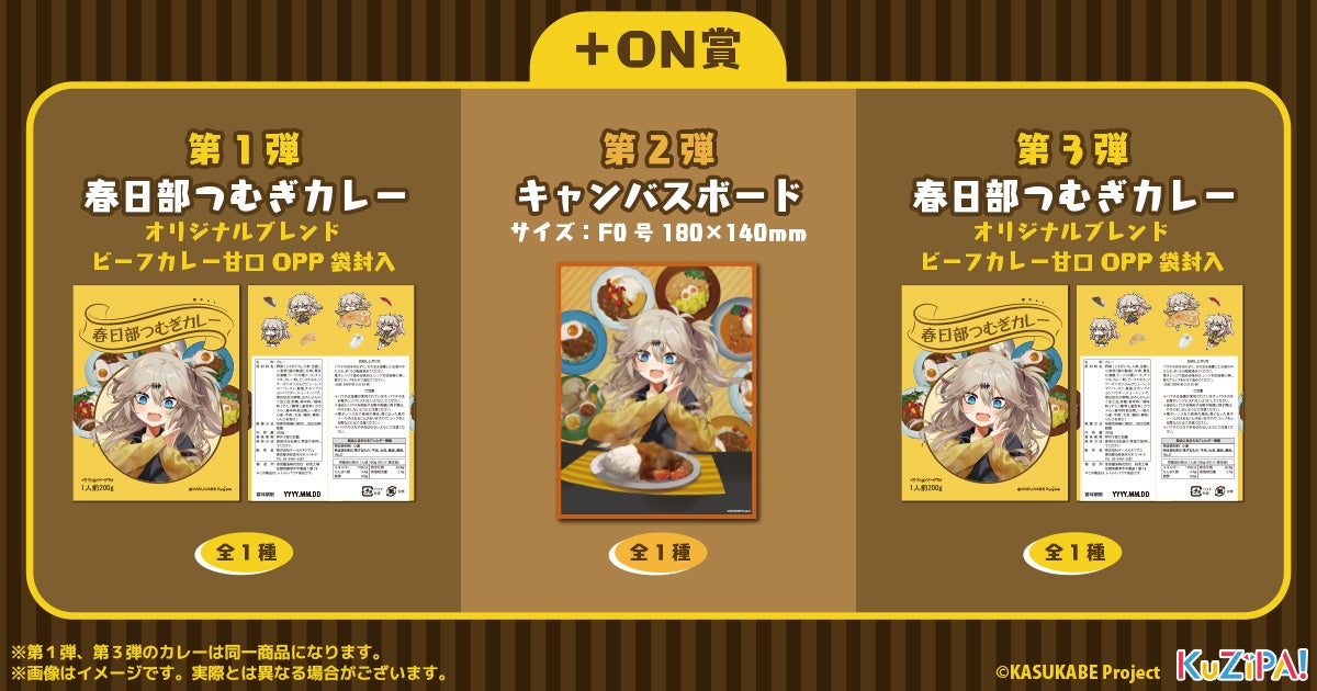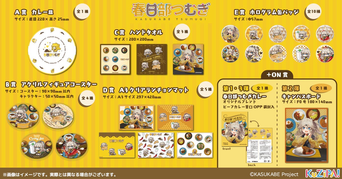 商品は、カレー皿、アクリルフィギュアコースター、ハンドタオル、A3クリアランチョンマット、ホログラム缶バッジ、「+On Challenge」景品の春日部つむぎカレー、キャンバスボードなど、春日部つくしの大好きなカレーをテーマにしたクジパ限定描き下ろしデザインのアイテムを是非ゲットしてください!